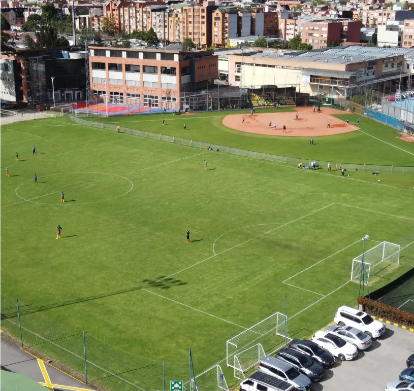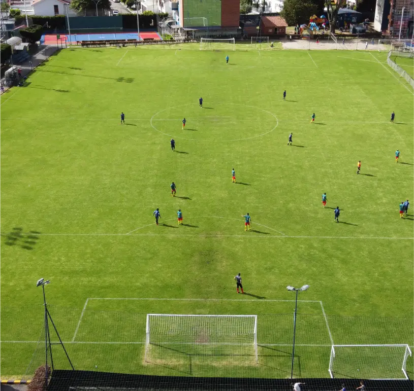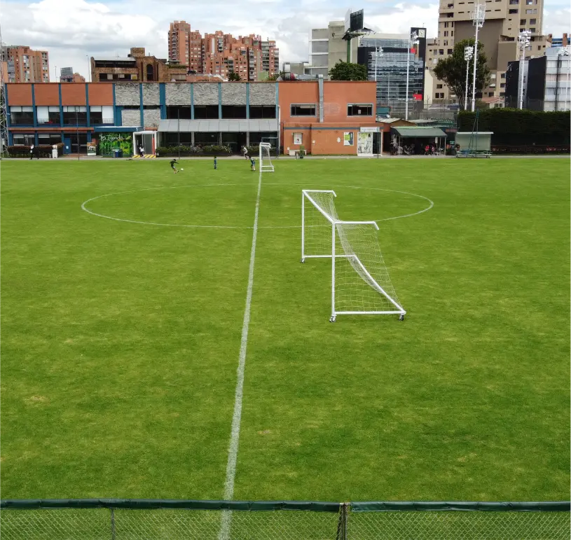 Un campo de césped natural con dimensiones FIFA (69 x 105 m), ideal para encuentros de alto nivel. Su sistema de drenaje de última tecnología garantiza un terreno óptimo durante todo el año, perfecto para la competencia y el entrenamiento.