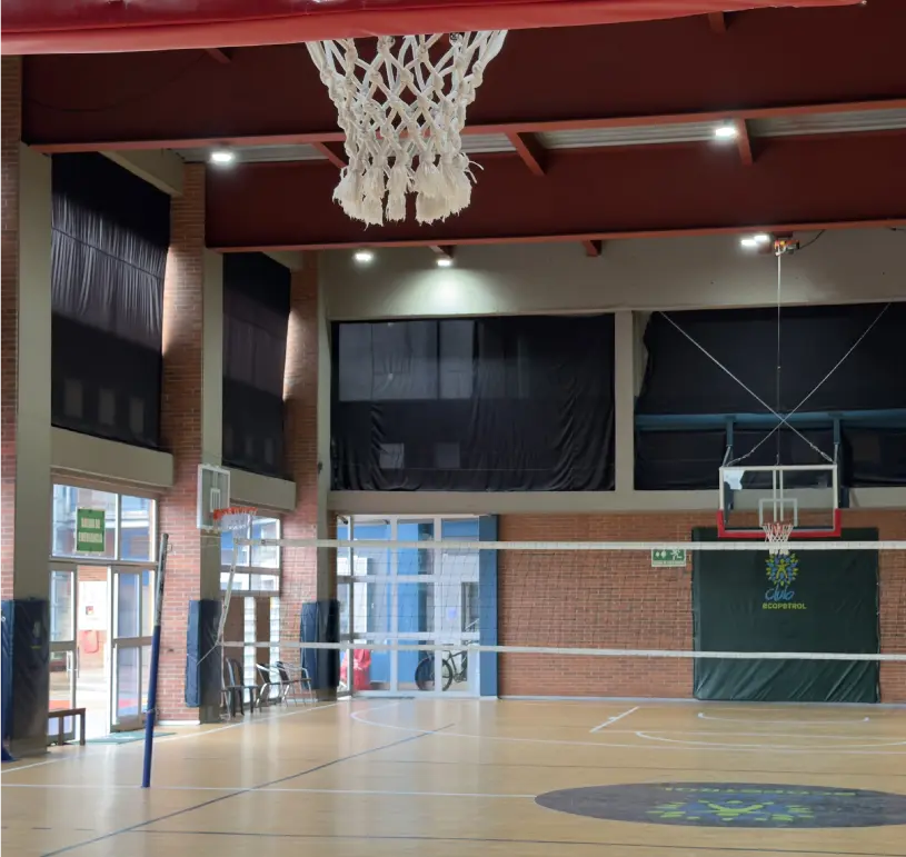 Este coliseo cubierto combina funcionalidad y comodidad. Su piso tipo madera y la iluminación LED crean el escenario ideal para torneos y entrenamientos tanto de baloncesto como de voleibol, en un entorno techado y seguro.